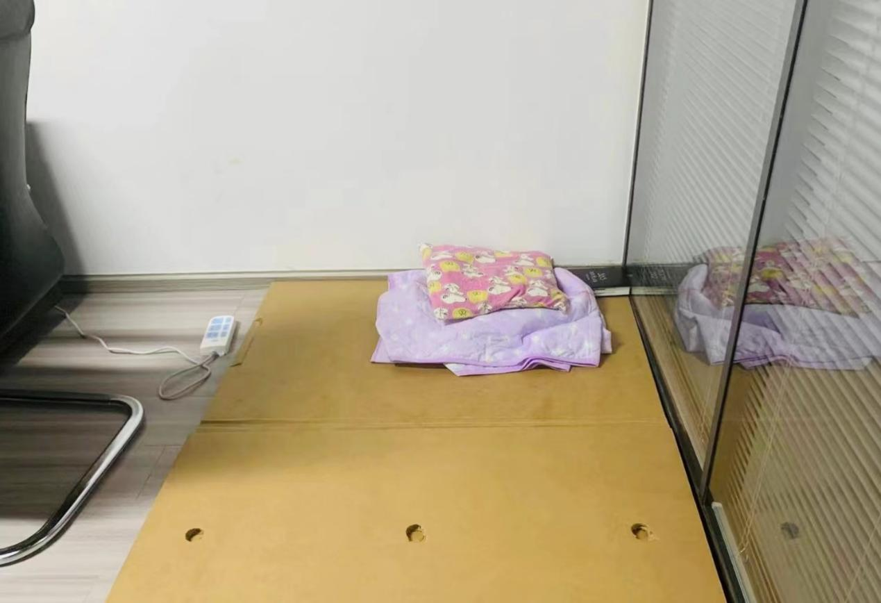 ▲封闭在公司的应急小组的临时床铺