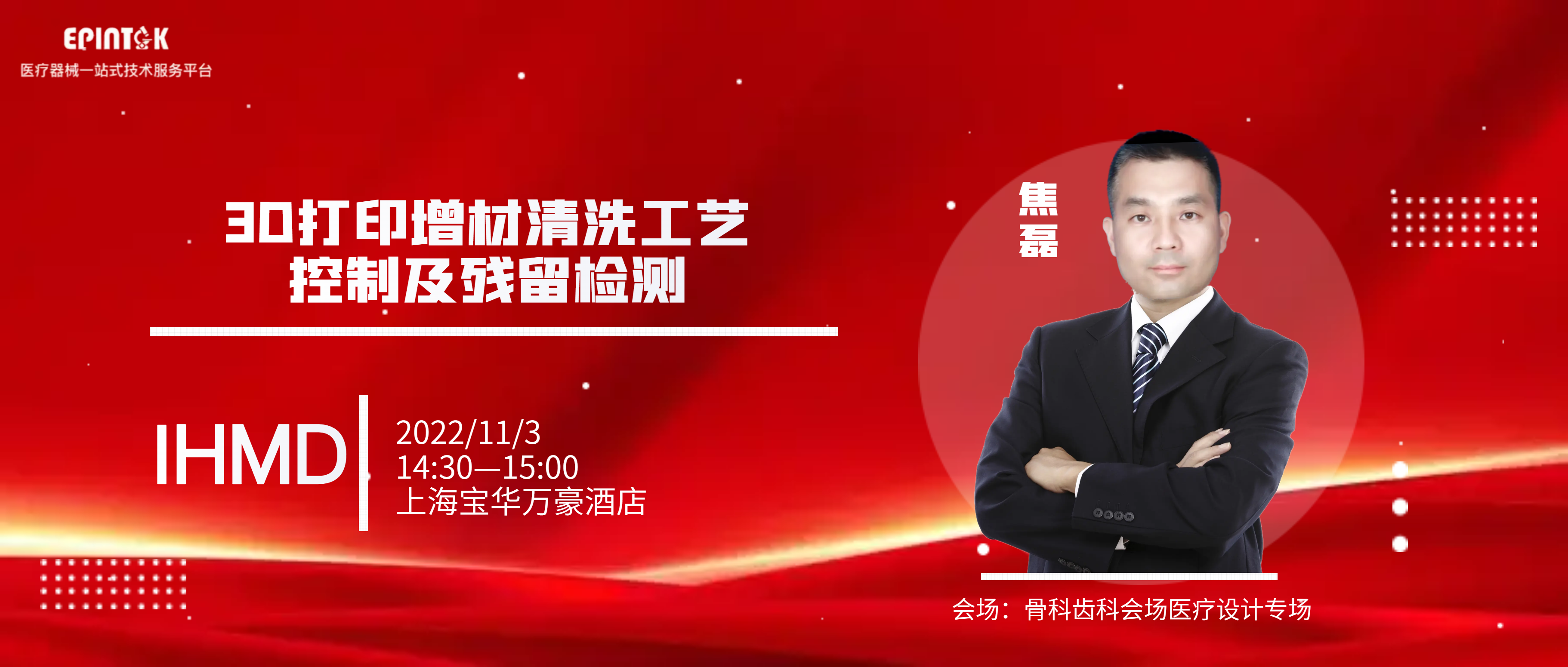 熠品诚挚邀您参加11月3-4日IHMD2022·第三届国际高端医疗器械论坛,本次iMedical Show展位将增加至85+,熠品将在11月3日下午14:30-15:00骨科齿科会场医疗设计专场为您讲解《3D打印增材清洗工艺控制及残留检测》欢迎大家到现场和熠品的技术专家进行交流。
