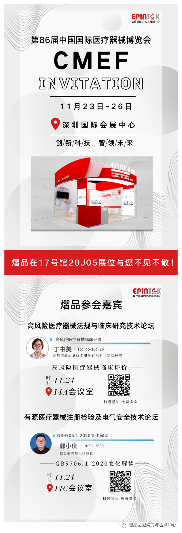 熠品将在11月24日下午15:45-16:30, 14A会议室为您讲解《高风险医疗器械临床评价》和14:30-15:30, 14C会议室讲解《GB9706.1-2020变化解读》欢迎大家到现场和熠品的技术专家进行交流。